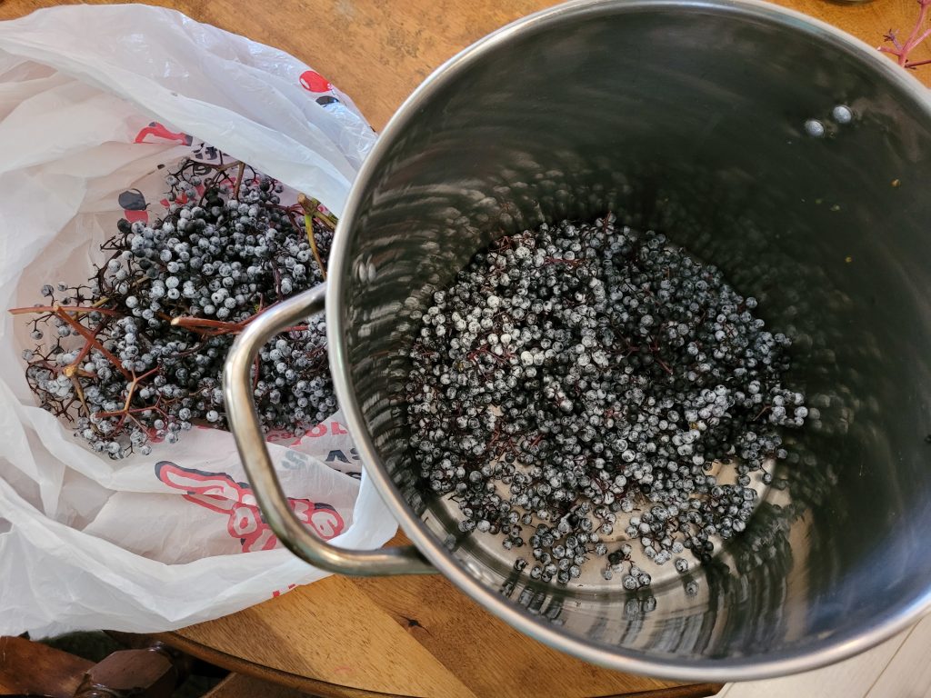 A few days ago, Mark brought home a couple of bags of elderberries he had picked out in the back 40. I hopped to it to clean them and turn them into elderberry syrup.
